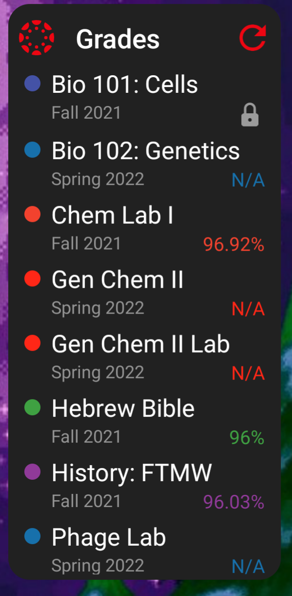 I am struggling with clutter on my Grades Widget. The Widget does not automatically remove previous classes, so my Home Screen looks like Picture 1. Classes like Bio 101, Chem Lab I, Hebrew Bible, etc. are still there despite the classes being marked as "Past Enrollments" (See Picture 2). What can I do to remove these classes from my Widget? Not being able to see the grades in my classes quickly and easily ruins the purpose of having the widget.