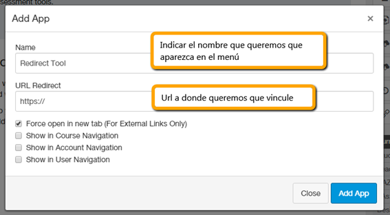 Si queremos añadir un nuevo botón de navegación es posible pero utilizando una Apps de Canvas llamada “Redirect Tool”.