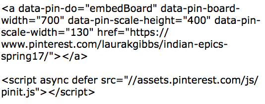 I'm a huge fan of Pinterest, one of the ways I use it for my classes is to create a Board for each class each semester where I pin the stories in my students' projects. The projects are up and running now, so here are the Boards: Myth-Folklore and Indian Epics. As you can see, I embed the Boards on the Project Directory page for each class, and in this post I'll explain how you can also embed Pinterest Boards like that in Canvas; click here for the Canvas Page: