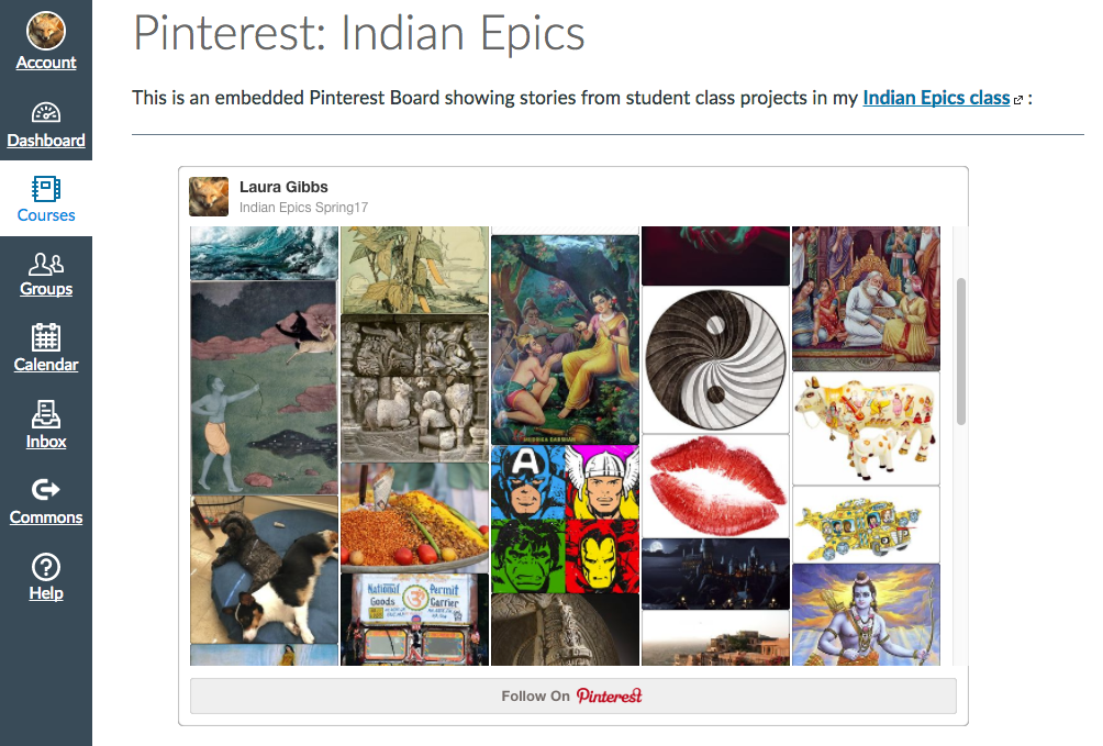 Here is the resulting Pinterest: Indian Epics. Now, as I pin new stories to the Board from my students' projects (there are new stories every week!), those pins will show up automatically inside Canvas.