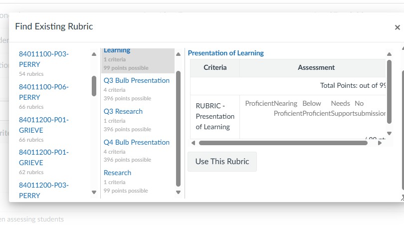 Rubrics created in previous courses or assignments, including those from archived courses or sandboxes, remain accessible when searching for rubrics to attach to new assignments. This is because when you use the 'Find a Rubric' tool, Canvas displays rubrics from all courses in which you have an instructor role, not just the current course. This can result in a long list of rubrics from multiple years and courses, which may cause confusion when searching for the correct rubric.