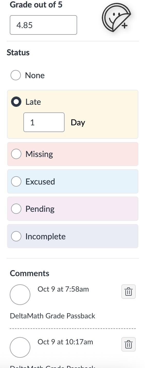 As I have been doing, I am going to have to pay attention to which students have earned full credit on a Delta Math assignment and monitor Canvas to see if anyone is marked late after the fact. Then I will have to go back in and manually change their notation from "Late" to "None." This is tedious and frustrating.