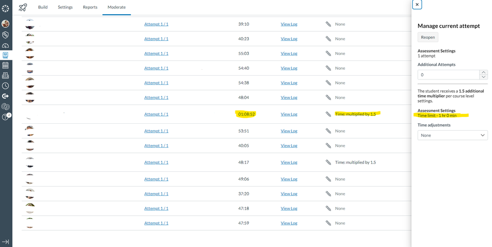I have a student who was given additional time on an exam in New Quizzes -- time their instructors did not set for them. While the rest of their classmates who received the same 'time multiplied by 1.5' extension were given one hour to take the exam, and this is the time reflected in the Assessment Settings section of their Moderate page, the time column shows that they took eight additional minutes. (See photo below in yellow highlighted areas; names and scores removed for privacy.)