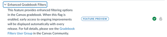 After a period of extensive testing and feedback collection, our team has decided to make "Enhanced Gradebook Filters" the standard experience for all users. This feature, which was initially introduced as a preview, provides instructors with a more efficient and intuitive way to organize and sort their gradebooks. Its adoption by the Canvas community showcased its value, leading to the decision to make it the default gradebook experience. After August 19th, users will no longer see “Enhanced Gradebook Filters” on the Feature Options menu and the feature will be set to “on/locked” for all users.